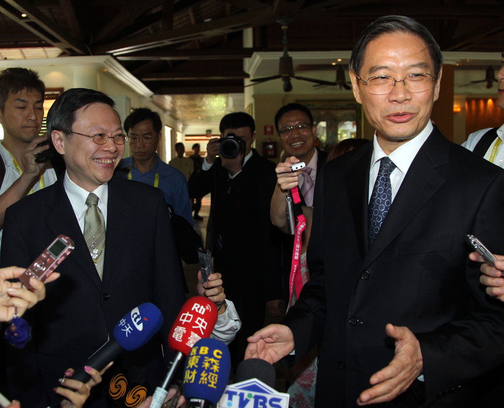 2013年亞太經(jīng)合組織峰會(APEC)間隙,國臺辦主任張志軍與臺灣陸委會負(fù)責(zé)人王郁琦會面寒暄。(網(wǎng)絡(luò)圖)
