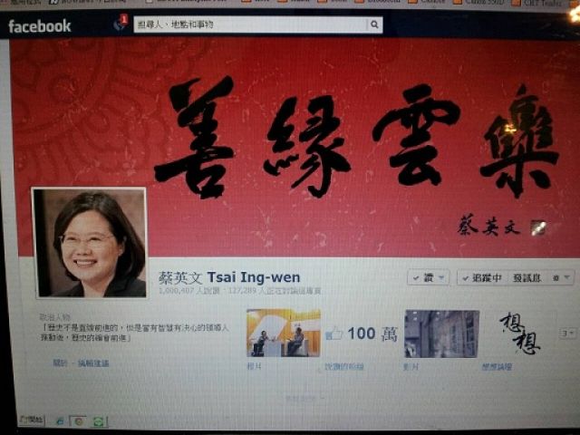 前民進(jìn)黨主席蔡英文臉書粉絲破百萬人(臺媒翻攝自蔡英文臉書)