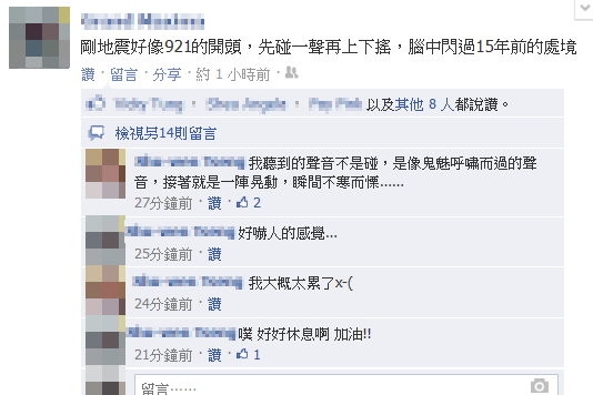 相對(duì)于臺(tái)北市內(nèi)的強(qiáng)烈感受,一水之隔的新北市似乎就落差很大。有三峽民眾坐在家中,表示“一點(diǎn)感覺都沒有”,也有剛好遛狗2小時(shí)回到家的人貼文與朋友開玩笑說:“就整個(gè)人凍僵掉,超級(jí)僵,有一種大家都有被震到,我卻沒有的失落感。”