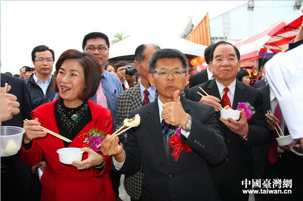 在開幕式上,臺(tái)灣行政部門“政務(wù)委員”楊秋興品嘗了習(xí)近平主席吃過的北京慶豐包子,并豎起拇指連連稱贊。(中國臺(tái)灣網(wǎng) 李婷婷 攝)
