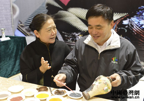 臺北市長郝龍斌參觀臺北地壇廟會,與專業(yè)技術(shù)人員現(xiàn)場互動交流。(圖片來源:北京東城區(qū)臺辦)