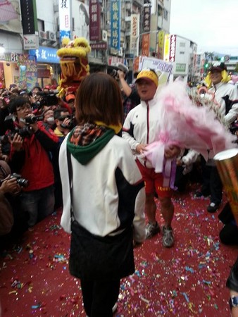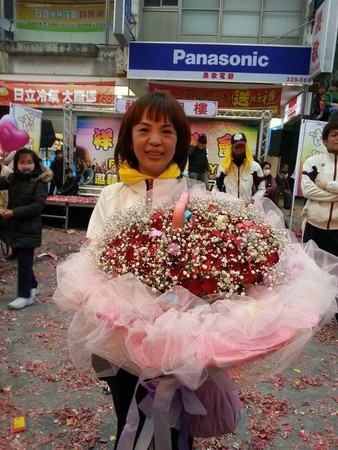 臺(tái)東元宵節(jié)炮炸邯鄲爺,今天出現(xiàn)不一樣的肉身邯鄲,手上的榕樹葉換成一束粉紅色玫瑰花,頭上綁著“為愛而戰(zhàn)”黃色布條,自信的挺身接受炮炸。