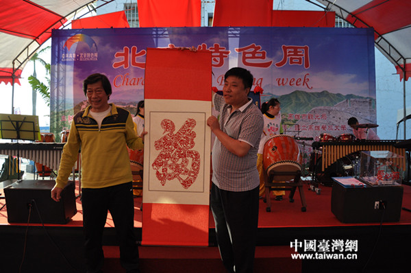 一位來自臺灣的老師,每天都到拍賣現(xiàn)場參與拍賣并將拍得物品送給唐氏癥關(guān)愛者協(xié)會的唐寶寶。北京市臺商投資服務中心高克祥主任將徐陽剪紙的“福”字送給這位愛心老師。(中國臺灣網(wǎng) 李婷婷 攝)