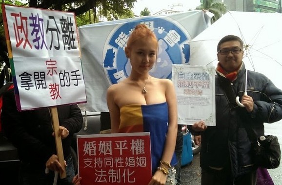 中國臺灣網2月19日消息 據(jù)臺灣“東森新聞”報道,素有“I級艷后”與“匈奴女神”之稱的藝人馬友蓉,19日上午冒著寒風細雨,以上半身裹著彩虹旗的裝扮,赴“立法院”向國民黨“立委”賴士葆嗆聲,批評他不應將宗教的手伸進行政機關,她擔心,如此一來,支持同志婚姻平權的聲音無法生存,“性平會”將淪為“一言堂”。