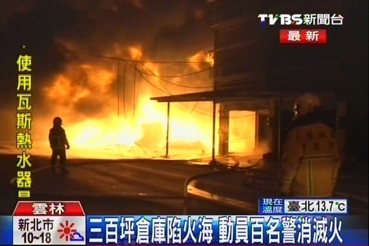 大火不斷燃燒,濃濃黑煙直竄,300坪大的倉(cāng)庫(kù)陷入火海,就連電線桿也耐不住高溫?zé)龜,窗戶玻璃也裂開(kāi),場(chǎng)面一度危急。