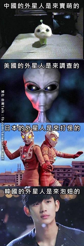 圖中有周星馳《長江七號》中可愛的外星人七仔,它被說是到地球來賣萌;一般人印象中的大眼光頭“美國外星人”,被說是來調查地球的;至于來自日本的奧特曼,則被說是來打怪的;最后在《來自星星的你》中深情的“韓國外星人”都教授,更被網(wǎng)友說是想到地球泡妞。
