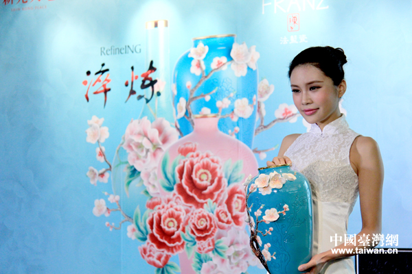 法藍(lán)瓷24日在京推出“紅樓夢”系列瓷品,圖為詮釋探春所抽杏花“名簽”的瓷瓶——春曉(中國臺灣網(wǎng) 李徽 攝)