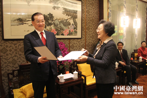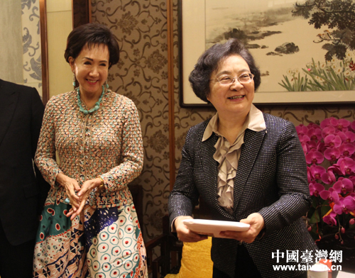 林文漪向連戰(zhàn)夫人連方瑀贈送禮物。(中國臺灣網(wǎng) 王怡然 攝)