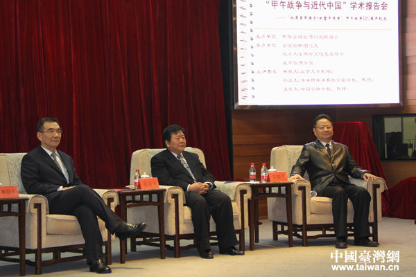 中華全國(guó)臺(tái)灣同胞聯(lián)誼會(huì)于2月28日下午在北京臺(tái)灣會(huì)館舉辦“甲午戰(zhàn)爭(zhēng)與近代中國(guó)”學(xué)術(shù)報(bào)告會(huì)。圖為三位主講嘉賓。(中國(guó)臺(tái)灣網(wǎng) 高斯斯 攝)