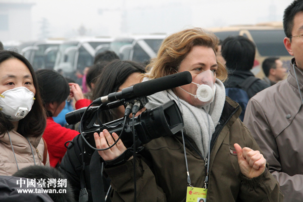 外國(guó)記者的防灰霾口罩造型特別。(中國(guó)臺(tái)灣網(wǎng) 王怡然 攝)