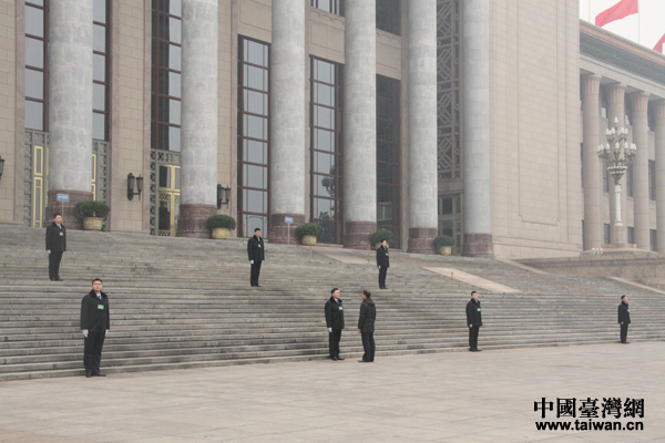 3月3日,中國人民政治協(xié)商會議第十二屆全國委員會第二次會議在北京人民大會堂開幕。開幕會開始前,人民大會堂安保人員準(zhǔn)備就緒。(中國臺灣網(wǎng) 張潔 攝)