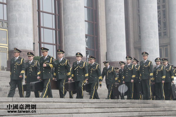 開幕會開始前,中國人民解放軍樂團進(jìn)入人民大會堂。(中國臺灣網(wǎng) 張潔 攝)