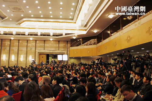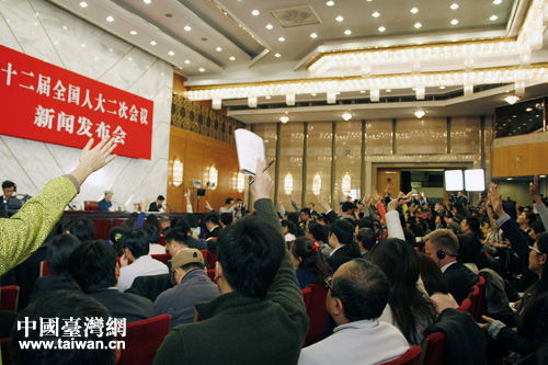 十二屆全國人大二次會議今日在人民大會堂舉行新聞發(fā)布會,與會媒體爭相提問。(中國臺灣網(wǎng) 王思羽 攝)