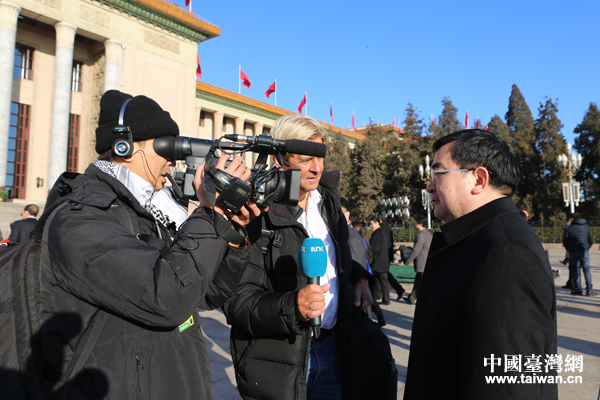 挪威國家廣播電視臺記者采訪全國人大代表。(中國臺灣網(wǎng) 王思羽 攝)