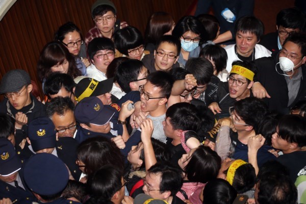 為表達對國民黨“召委”張慶忠17日在“內(nèi)政委員會”中,宣布將《兩岸服貿(mào)協(xié)議》直接送臺“立法院院會”存查的不滿情緒,昨晚在臺“立法院”外“守護臺灣民主之夜”的抗議學生和民眾,晚間9點多沖破“立院”大門,上百位學生更進一步直奔議場占據(jù)主席臺。直至凌晨1點左右,臺“立法院”外、濟南路上已經(jīng)陸續(xù)聚集1000多人,仍有民眾從面對群賢樓右側(cè)的入口傳送物資,或著進入議場。