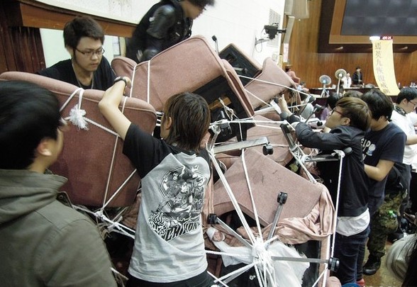中國臺灣網(wǎng)3月21日消息 據(jù)臺灣“東森新聞”報道,臺灣“立法院”遭遇史上頭一次民眾占領(lǐng),學(xué)生在“立法院”議場待47小時,議場內(nèi)座椅都被學(xué)生當(dāng)作砌墻材料,阻擋警方攻入議場。媒體報導(dǎo)修復(fù)議場粗估須1個月、花費約1億元(新臺幣,下同),議事人員趕忙從窗戶進入議場,撤離張大千2幅真跡與蔣介石時期的木柜以減少損失,“立法院長”王金平也呼吁學(xué)生要愛惜公物,不要破壞。