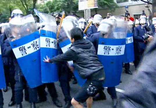 學生肉身撞盾牌,不肯驅離鎮(zhèn)暴警察直接逮捕。(臺媒圖)