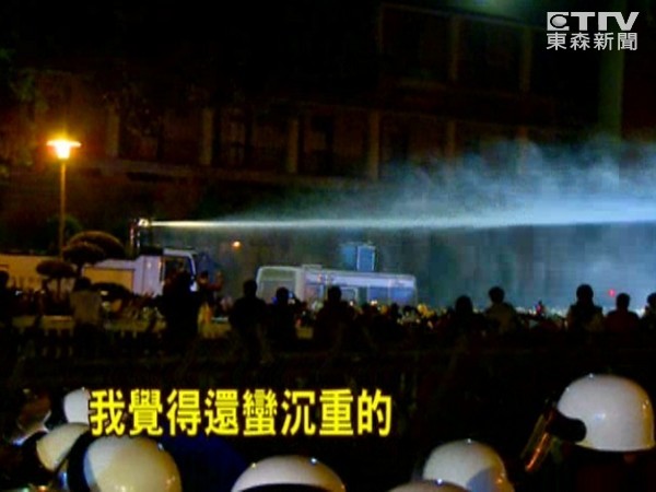 2008臺北市警局曾出動水車驅(qū)離群眾,平常備而不用的水車,6年后再次派上用場,卻是張姓警察最不樂見的。一方面遭受攻擊,一方面必須要執(zhí)行勤務(wù),面對失控的場面,他坦承當(dāng)下心情很復(fù)雜,從警22年,曾經(jīng)在2000年“大選”后的抗議行動中執(zhí)行過任務(wù),沒想到13年后值勤,會再次坐上水車駕駛座。他表示,“大家都沒有拍到的,攻擊警察,甚至到最后有人拿鐳射槍,一直在照我的眼睛,我覺得還蠻沉重的!