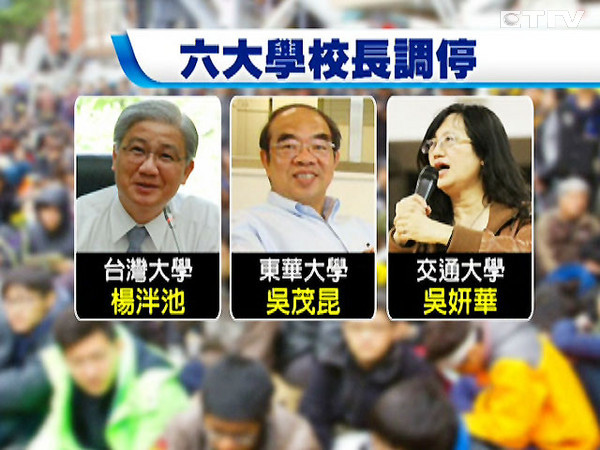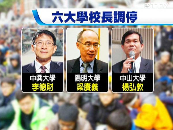 包括臺大楊泮池、東華吳茂昆、交大吳妍華、興大李德財、陽明梁賡義以及中山楊弘敦等北中南六位公立大學(xué)校長昨天發(fā)表聯(lián)合聲明,不樂見學(xué)生因為反服貿(mào)導(dǎo)致學(xué)習(xí)影響,建議透過不具政黨色彩的公正團(tuán)體,組成溝通平臺,盡快弭平當(dāng)局與學(xué)生雙方歧見。