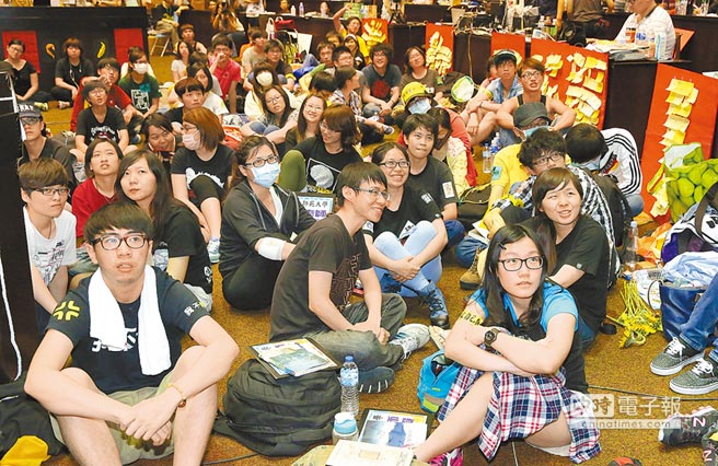 占據(jù)議場內(nèi)的學(xué)生29日透過網(wǎng)絡(luò)電視收看馬英九記者會(huì)(圖片來自臺(tái)媒)