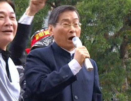 張安樂下午2時(shí)多現(xiàn)身,2時(shí)36分登上宣傳車,帶頭喊口號(hào)“民進(jìn)黨貪污黨”。(中國臺(tái)灣網(wǎng) 朱煉)