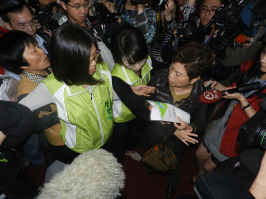 民進黨為阻擋審查,昨天下午就搶先進入“立法院”群賢樓9樓大禮堂,占據(jù)會議主席臺。今天一早7時30分,約20位“立委”帶著助理在會議室外靜坐,堵住通道,只放行“內(nèi)政委員會”的議事人員。