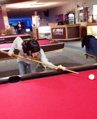 舞會(huì)之后由老師帶隊(duì),徐嬌及同學(xué)們一起到附近大學(xué)附設(shè)的活動(dòng)中心打保齡球、撞球,“女生都迫不及待地?fù)Q下了禮服和高跟鞋,我則是連妝都立馬卸了,踏上了人字拖,嘴里再叼上個(gè)雞塊…”展現(xiàn)自然的一面,卻從拿桿姿勢(shì)看得出來(lái)頗有老手架勢(shì)。(中國(guó)臺(tái)灣網(wǎng) 高旭)