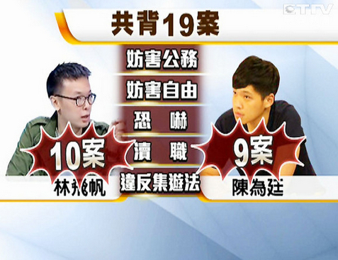 學(xué)生退出立法院后,警方立刻接管進(jìn)駐搜證,臺北檢方統(tǒng)計(jì),到4月10日為止,整個(gè)反服貿(mào)運(yùn)動相關(guān)案件總共分案受理25案,其中林飛帆和陳為廷就涉嫌刑法妨害公務(wù)、妨害自由、恐嚇、瀆職以及違反集游法等罪嫌,林飛帆被告發(fā)10個(gè)案件,陳為廷也有9個(gè),2人身上共背19案。
