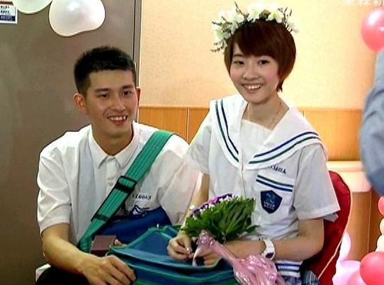 小晏和大諺15日在醫(yī)院舉辦婚禮,沒有穿白紗禮服,也沒有走紅毯,為了紀(jì)念高中開始的初戀,兩人穿上鶯歌高職的制服、背上書包,由12位護(hù)理人員當(dāng)伴娘;大諺拿出當(dāng)兵的氣勢(shì),大聲告白“你愿意嫁給我嗎?”,把新娘也逗笑了,小晏回答:“可是我快死掉了,我剩兩個(gè)月的生命而已”,大諺深情地說:“沒關(guān)系我愿意,照顧你一輩子,我愿意”。