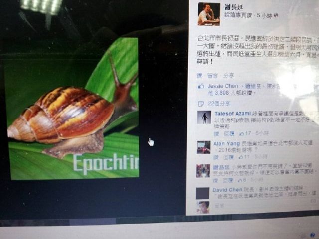 民進黨臺北市長整合速度,謝長廷貼“蝸牛照”嘆無語(圖片為翻攝自謝長廷臉書,來自臺媒)