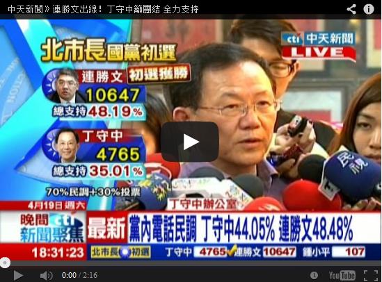 國(guó)民黨臺(tái)北市長(zhǎng)選舉黨內(nèi)初選結(jié)果出爐,稍早丁守中出面表示,已經(jīng)盡了全力,雖敗猶榮,每個(gè)人的票對(duì)他都有特別的意義,達(dá)感恩感謝,也呼吁黨要團(tuán)結(jié),他會(huì)支持連勝文,發(fā)揮1+1>2的效果,讓黨打贏這場(chǎng)選戰(zhàn)。(圖片來(lái)源:臺(tái)灣《中天新聞》)
