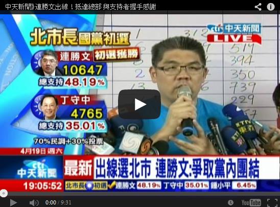 中國(guó)臺(tái)灣網(wǎng)4月19日消息 據(jù)臺(tái)灣《中國(guó)時(shí)報(bào)》集團(tuán)聯(lián)機(jī)報(bào)道,中國(guó)國(guó)民黨臺(tái)北市長(zhǎng)初選民調(diào)和投票結(jié)果今天出爐,國(guó)民黨榮譽(yù)主席連戰(zhàn)之子連勝文確定出線代表參選臺(tái)北市長(zhǎng)。