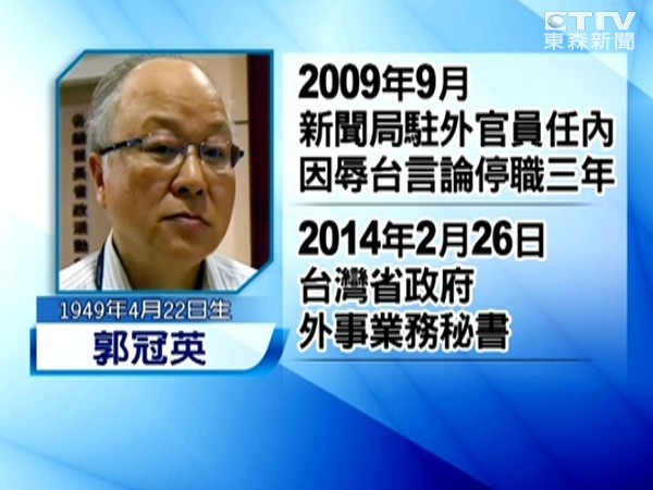 由于郭冠英在2009年間以“范蘭欽”等為筆名發(fā)表文章,遭“監(jiān)察院”通過(guò)彈劾,并經(jīng)“公務(wù)員懲戒委員會(huì)”決議“撤職并停止任用3年”。郭冠英3月出任“省府外事業(yè)務(wù)秘書”,4月滿65歲屆齡退休后,可領(lǐng)取每月高達(dá)8萬(wàn)余元月退俸,造成社會(huì)輿論嘩然,抨擊有濫用公共資源之虞,及違反程序、玩弄體制、因人設(shè)事、特權(quán)圖利等不公不義等違失。