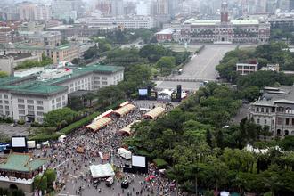 臺(tái)灣廢核行動(dòng)平臺(tái)號(hào)召民眾在臺(tái)北市凱達(dá)格蘭大道靜坐,他們要求停建核四,并將游行到忠孝西路,再躺下占據(jù)馬路,圖民眾在凱道集合現(xiàn)場。(圖片來源:臺(tái)灣聯(lián)合新聞網(wǎng))