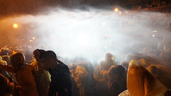 現(xiàn)場約3000位警方于今晨2點47分展開驅(qū)離行動,并從5點鐘開始,改以灑水方式進(jìn)行驅(qū)離。(圖片來自臺媒)