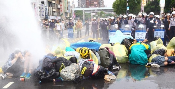 警方出動水車噴灑強力水柱。(臺媒圖)