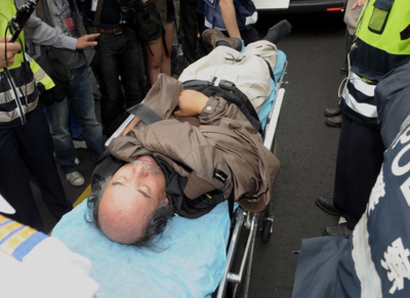 “公投護臺灣聯(lián)盟”總召蔡丁貴昨日再度號召群眾包圍“立法院”,蔡丁貴本人也企圖沖撞“立院”,但最后被警方制伏昏倒送醫(yī)。(圖片來源:臺灣“中央社”)