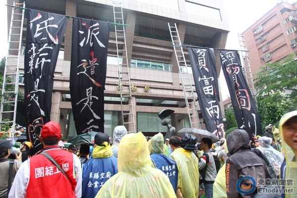 主辦單位設(shè)計(jì)用梯子掛著4塊大型布條,上面寫著:低薪是恥辱、派遣是元兇、貧富兩極化、經(jīng)貿(mào)圖利誰,還準(zhǔn)備“勞動(dòng)部長”潘世偉肖像的罐頭塔,祝他潘世偉步步高升,羽化登天。