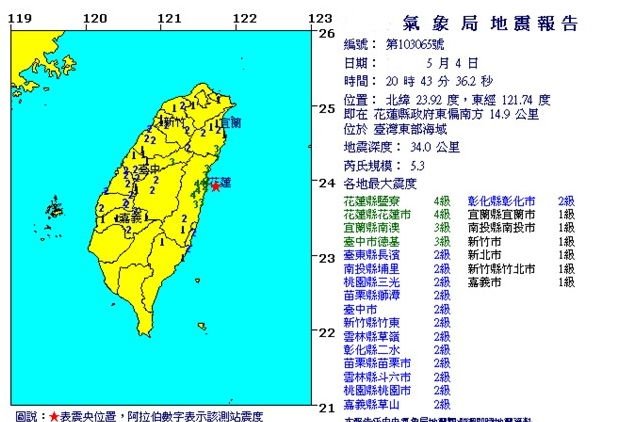 中國(guó)臺(tái)灣網(wǎng)5月4日消息 據(jù)臺(tái)灣“東森新聞”報(bào)道,臺(tái)灣4日晚間8時(shí)43分左右,花蓮地區(qū)附近發(fā)生規(guī)模5.3級(jí)有感地震,最大震度達(dá)4級(jí)。從今天凌晨開(kāi)始,花蓮地區(qū)即一直搖不停,晚間這起地震是有紀(jì)錄的第9起,之前的規(guī)模最大為3.9。