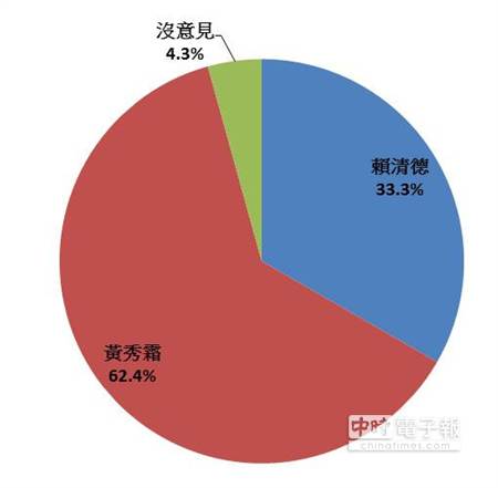 根據(jù)臺(tái)灣中時(shí)電子報(bào)于5月4日下午4時(shí)至5月5日上午8時(shí)進(jìn)行的最新online網(wǎng)絡(luò)投票顯示,黃秀霜有62.4%的支持率。賴清德有33.3%的支持率,較前日上升。有4.3%的投票率表示沒有意見,黃秀霜的網(wǎng)絡(luò)投票支持度一路領(lǐng)先現(xiàn)任市長賴清德,藍(lán)綠雙方持續(xù)對決中。(中國臺(tái)灣網(wǎng) 李學(xué)磊)