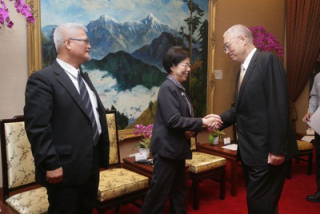 臺灣地區(qū)副領導人吳敦義(右)接見第五屆“監(jiān)察院院長”被提名人張博雅(中)、“副院長被提名人”孫大川(左)。(圖片來源:臺灣“中央社”)
