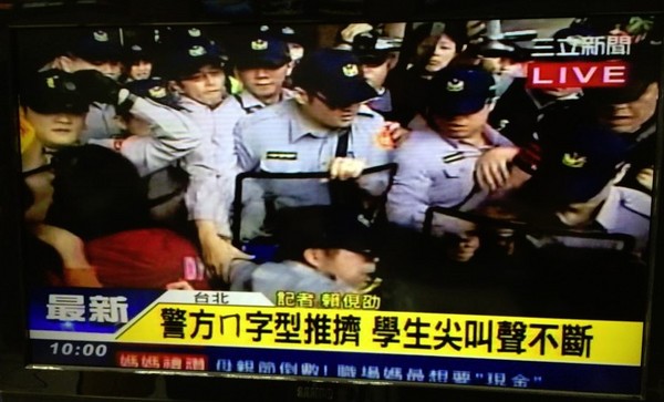 沒想到9點(diǎn)40分左右,學(xué)生無預(yù)警地轉(zhuǎn)身沖向警方,往前推擠進(jìn)臺(tái)北市政府,要求“郝龍斌出來面對(duì)”,現(xiàn)場(chǎng)爆發(fā)肢體沖突。有女學(xué)生大聲哭喊尖叫,目前已約有6名學(xué)生被警方強(qiáng)制拉進(jìn)市府。(中國臺(tái)灣網(wǎng) 朱煉)
