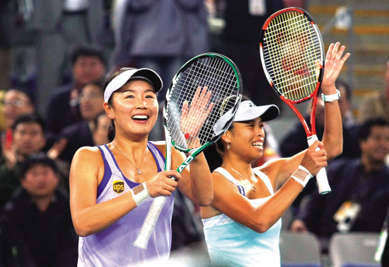 彭帥(左)和謝淑薇(右)在最新WTA官方公布的網(wǎng)球排名升上女子雙打世界第一。(圖片來自網(wǎng)絡)