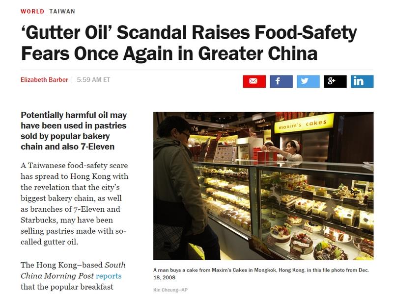 《時代雜志》網(wǎng)絡(luò)版今天以“‘餿水油’丑聞再次于大中華地區(qū)引起食品安全恐慌”為題報道,發(fā)生在臺灣的食品安全恐慌已經(jīng)散布到香港,香港最大的糕餅連鎖店以及7-Eleven、星巴克旗下連鎖店,可能都已經(jīng)銷售了以俗稱為餿水油制造的糕點。