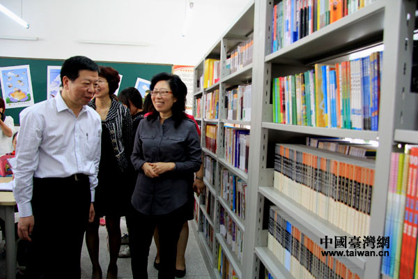 頂新國際集團(tuán)董事長特別助理王興華在圖書館參觀,了解孩子們的讀物配備情況(中國臺灣網(wǎng) 李徽 攝)