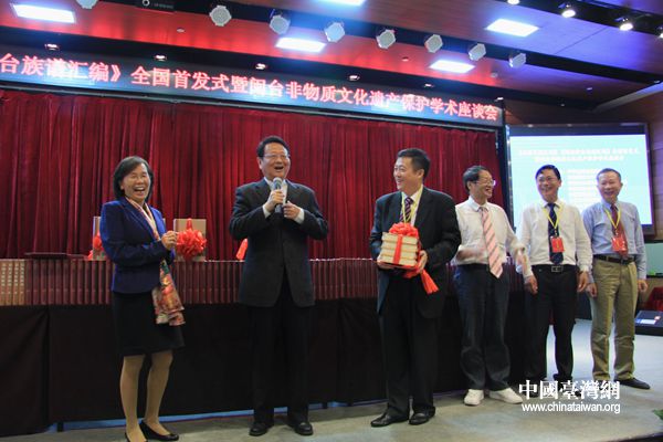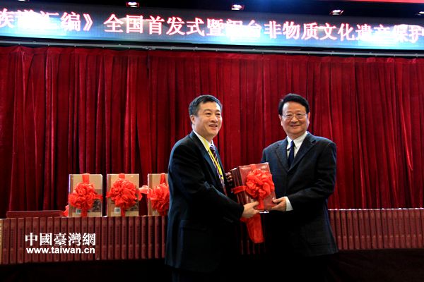 《臺(tái)海文獻(xiàn)匯刊》、《閩南涉臺(tái)族譜匯編》29日在京首發(fā),圖為臺(tái)灣成功大學(xué)人文社科中心副主任陳益源接受閩南師范大學(xué)贈(zèng)書(shū)(中國(guó)臺(tái)灣網(wǎng) 李徽 攝)