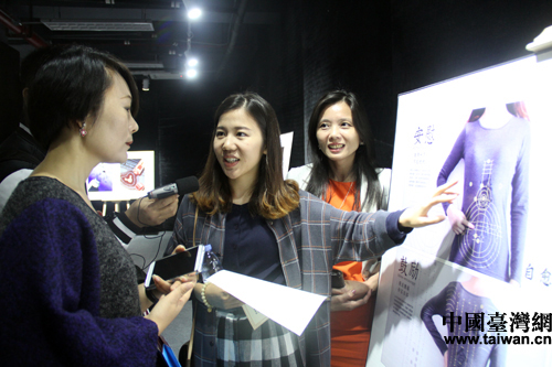 中國傳媒大學(xué)學(xué)生陳粵(中)攜《自愈——穿在身上的穴位圖表》亮相第二屆“華燦獎(jiǎng)”作品展。(中國臺灣網(wǎng)記者 李杰 攝)