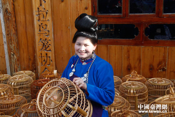 寨子里一棟苗家吊腳樓下堆放著眾多已編制好的精美鳥(niǎo)籠,一位身著苗族盛裝的姑娘低頭正制作鳥(niǎo)籠,吸引了眾多記者的目光,大家紛紛稱她為“鳥(niǎo)籠西施”。“鳥(niǎo)籠西施”名叫湯曉春,是2004年嫁到卡拉村。她介紹說(shuō),“‘卡拉’在苗語(yǔ)里是‘好’的意思?ɡ遄鲽B(niǎo)籠有400多年的歷史了,卡拉村鳥(niǎo)籠制作始于家庭生產(chǎn),用竹子編制而成的手工藝品是卡拉苗族人民的絕活。這里家家戶戶都會(huì)做鳥(niǎo)籠。以前因?yàn)榻煌ú槐悖龀鰜?lái)的鳥(niǎo)籠只能供自己觀賞,不能帶來(lái)任何收入!