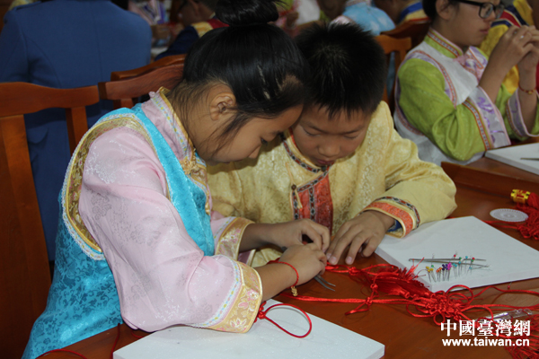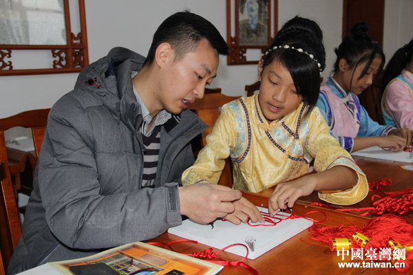 滿族學(xué)堂里孩子們正認(rèn)真地學(xué)習(xí)編織中國(guó)結(jié)(中國(guó)臺(tái)灣網(wǎng) 楊永青 攝)