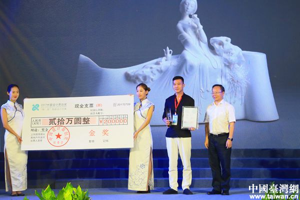 浙江省政協(xié)副主席陳小平為金獎(jiǎng)獲得者李錦峰頒獎(jiǎng),獲獎(jiǎng)作品為《顏如玉—暗香盈袖》。(中國(guó)臺(tái)灣發(fā))